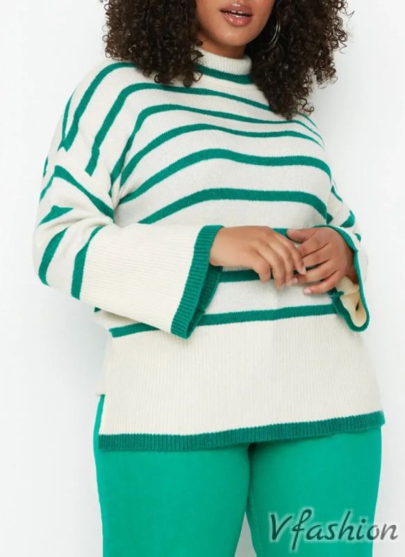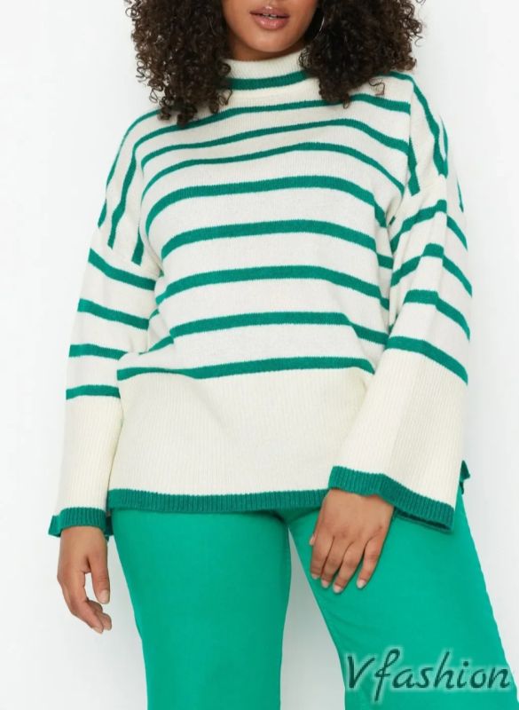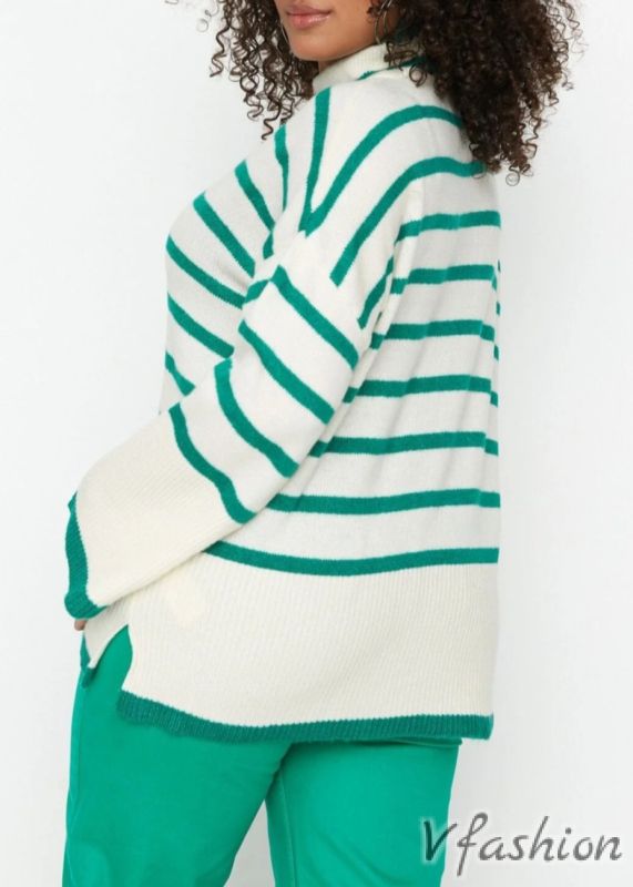 Много актуален пуловер от меко и приятно плетиво с поло яка и зелени райета.