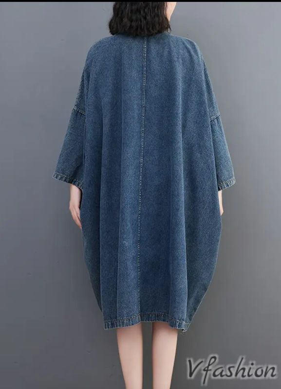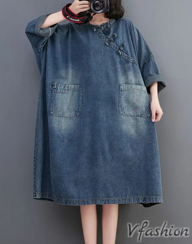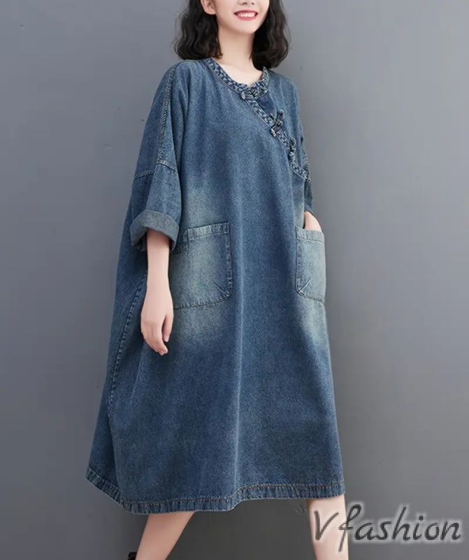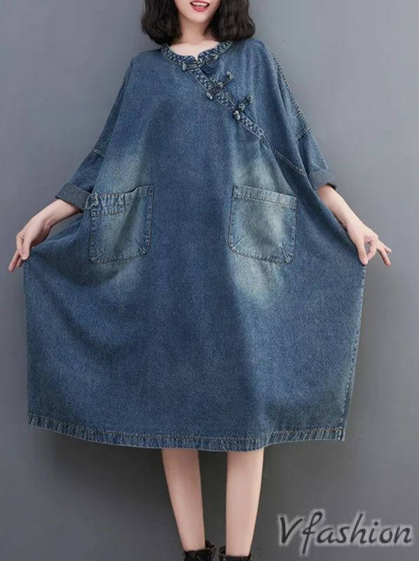 Широка рокля от дънков плат с удобни джобове.