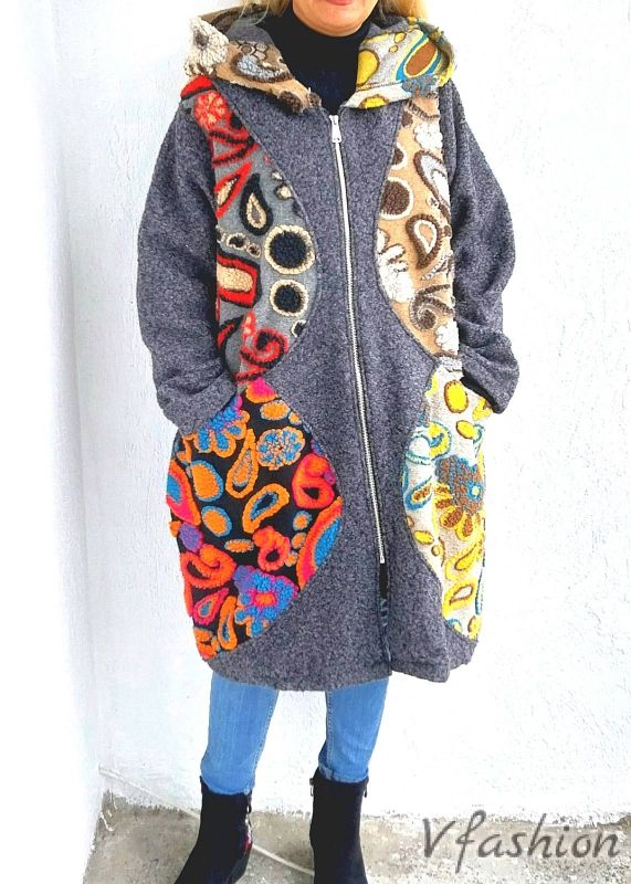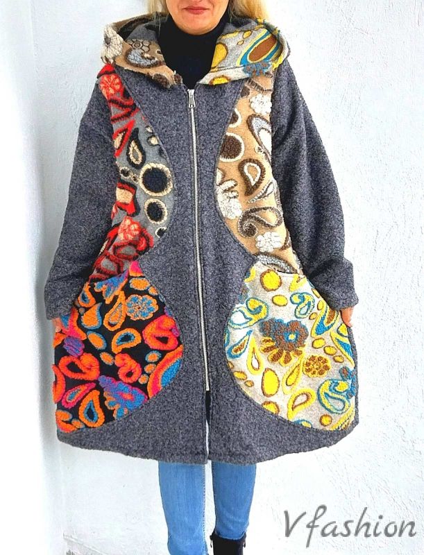 Вълнено палто с цветни акценти и качулка