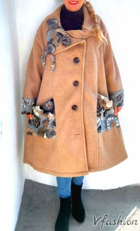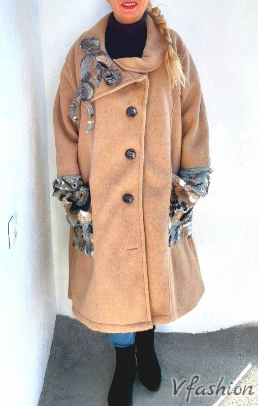 Вълнено палто с красиви акценти - карамел