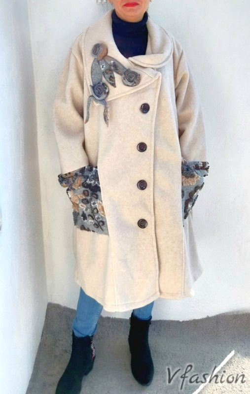 Вълнено палто с красиви акценти - екрю