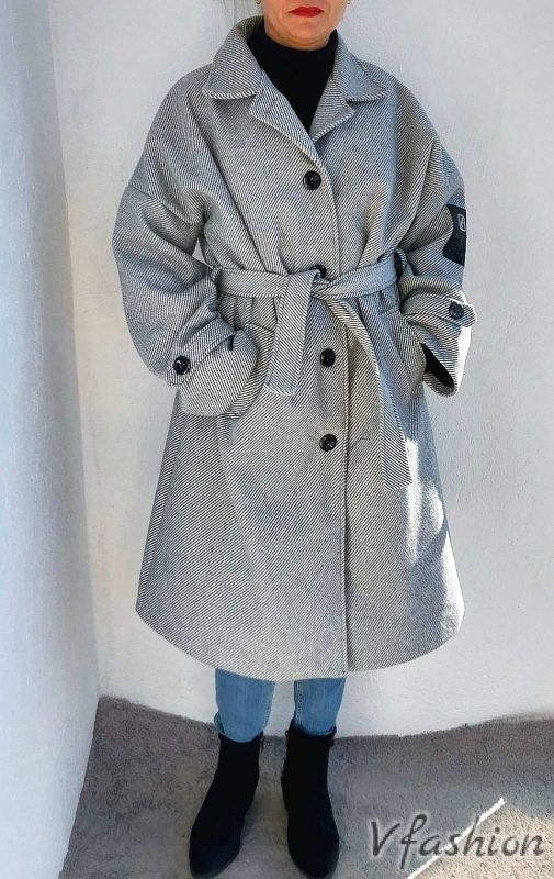 Много актуално и висококачествено палто с удобни джобове и колан. Палтото има хастар и акцент на единия ръкав.