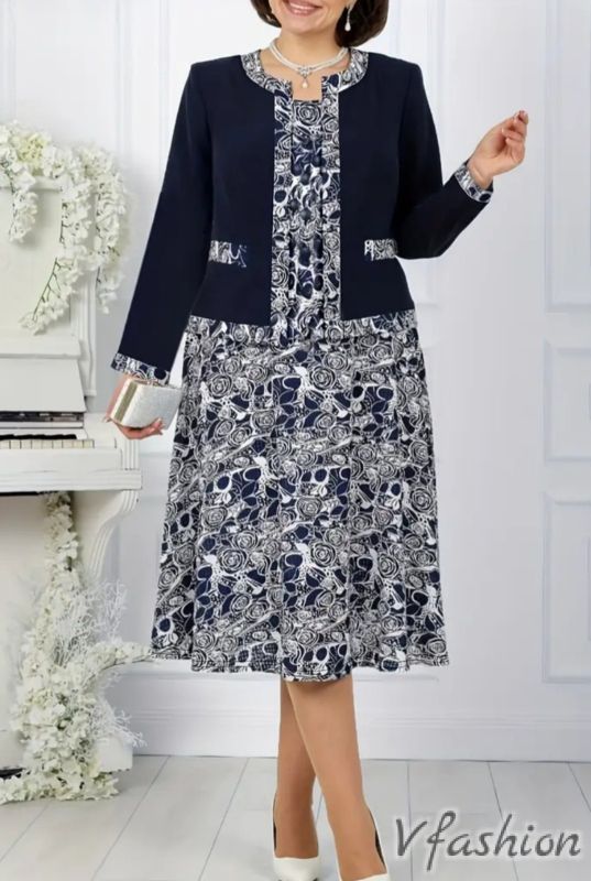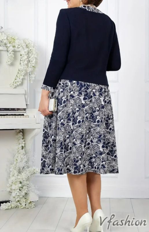 Елегантен комплект от рокля и сако в синьо и бяло. Материята е еластична.