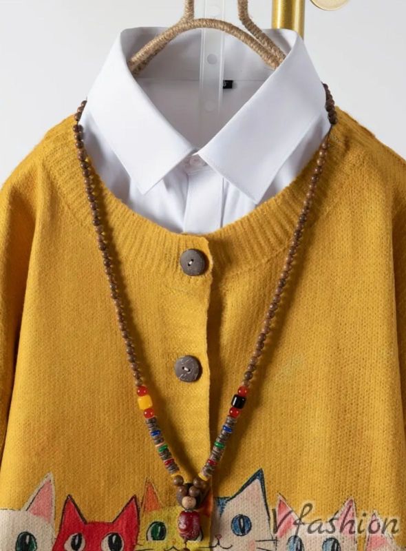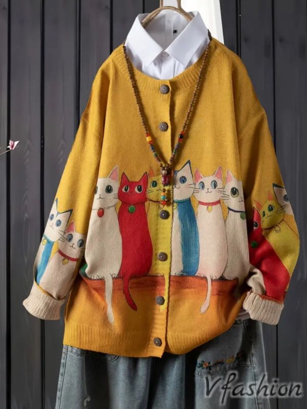 Ежедневна жилетка с принт цветни котета на жълт фон. Жилетката е от фино плетиво.