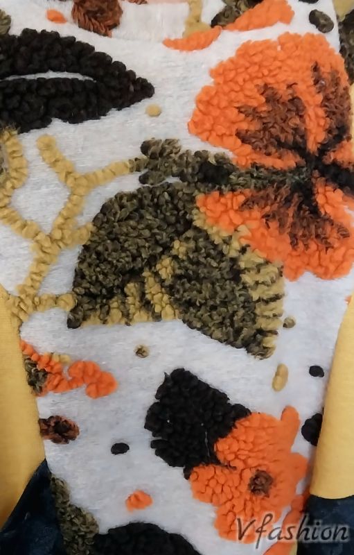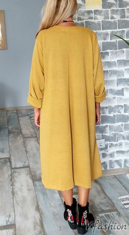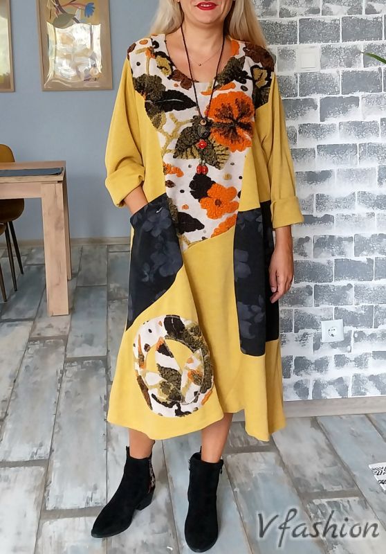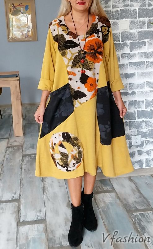 Арт рокля с много красиви, цветни акценти от вълнен плат. Роклята има удобен джоб. Материята е много качествена, плътна и леко еластична.