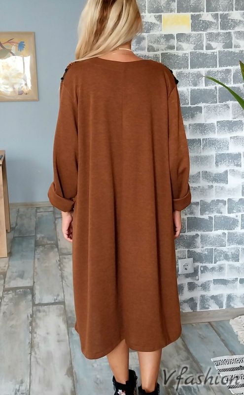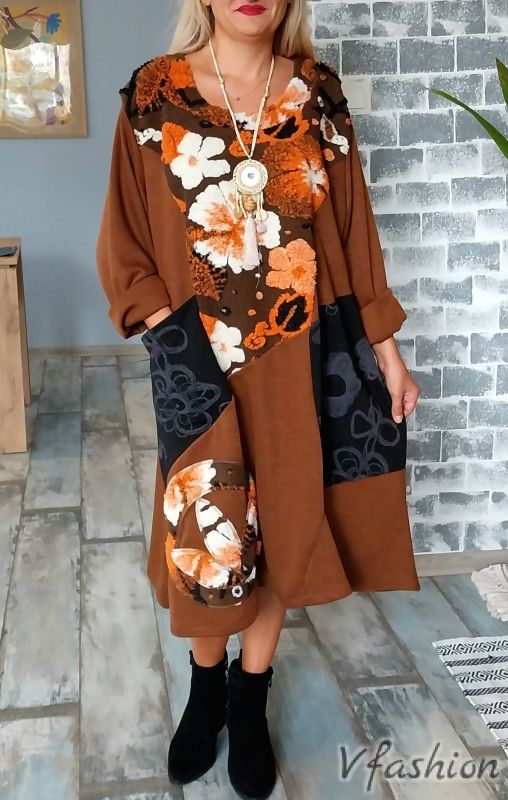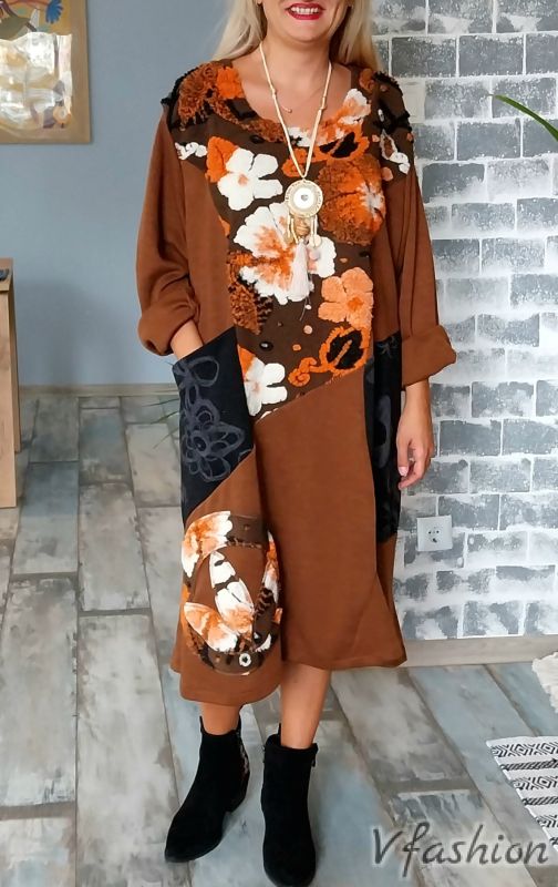 Арт рокля с вълнени акценти - кафява