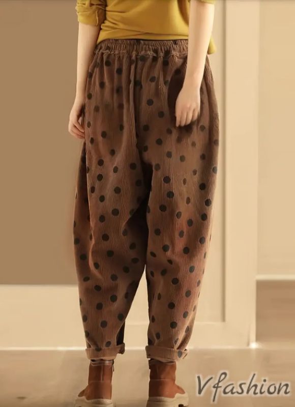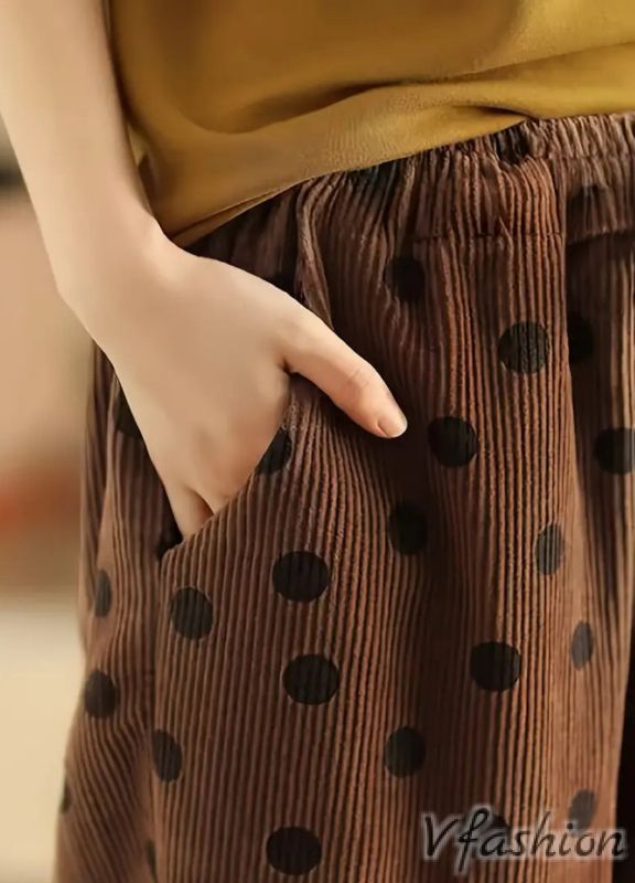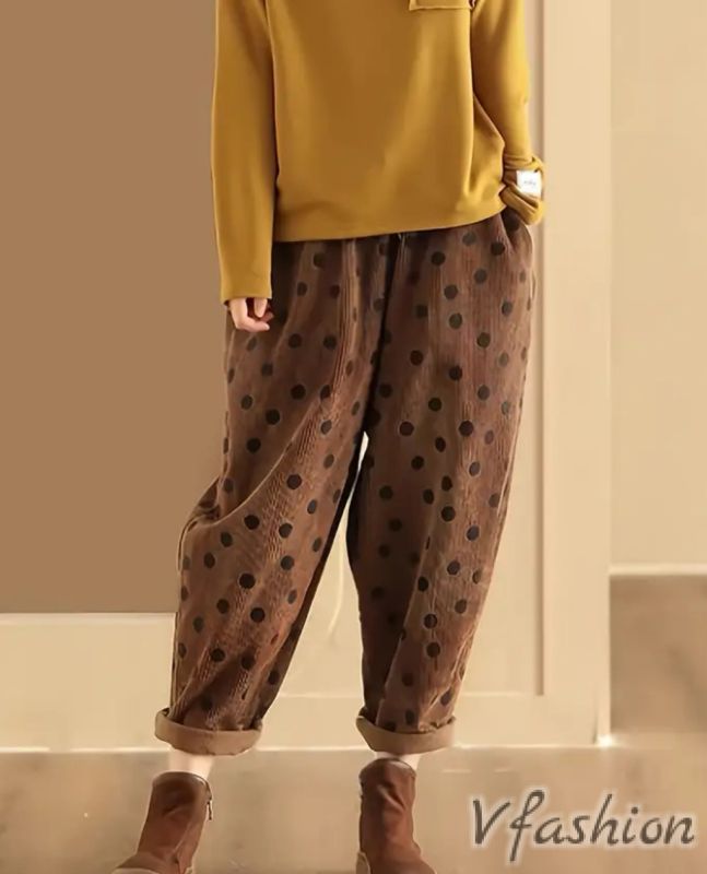 Много актуален панталон от ситно кадифе на точки. Има странични джобове. На талията е с ластик и връзки.