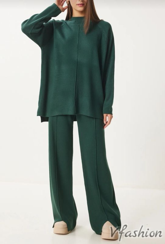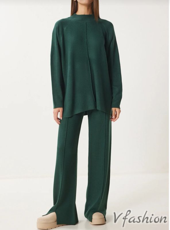 Висококачествен комплект от панталон и блуза от фино плетиво с ръб. Панталонът е на ластик.