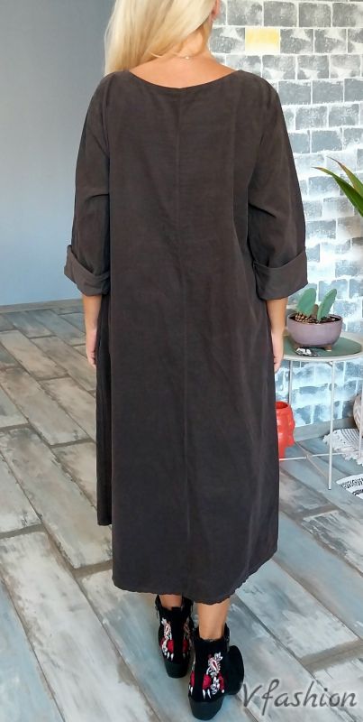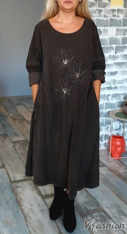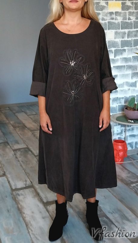 Много актуална рокля е от качествено ситно кадифе с апликации цветя. Роклята има странични джобове.