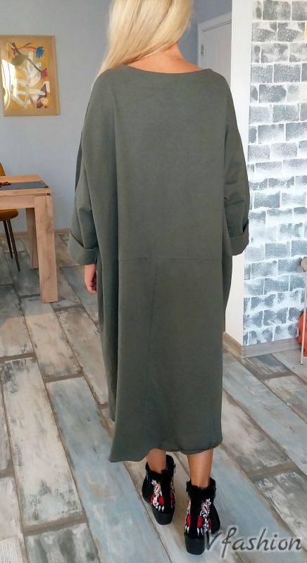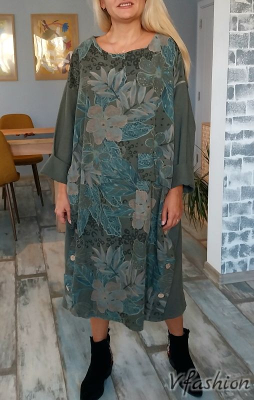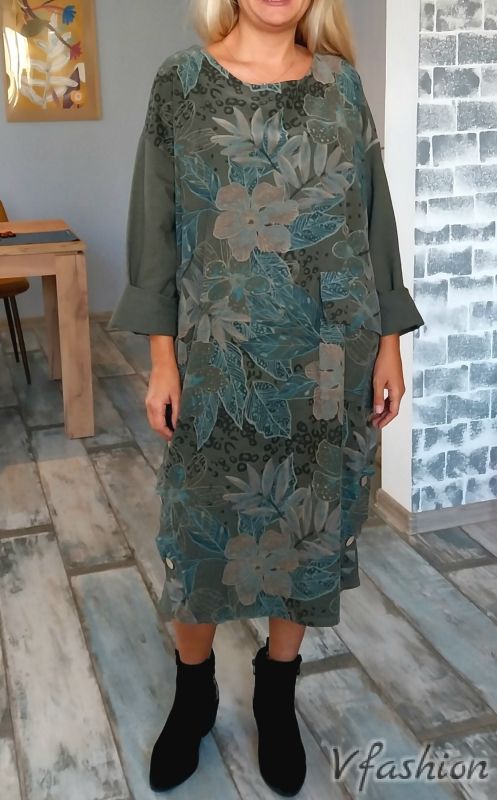 Много актуална рокля от качествено ситно кадифе с цветни, флорални мотиви. Роклята има удобен, голям джоб. Гърбът е от плътен, памучен плат.