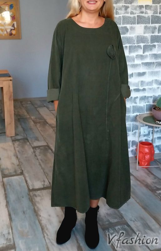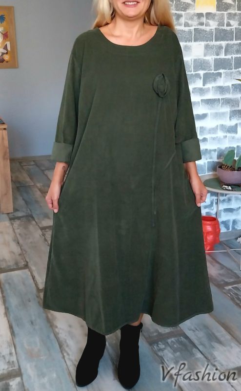 Много актуална рокля от качествено ситно кадифе с апликация цветя. Роклята има странични джобове.