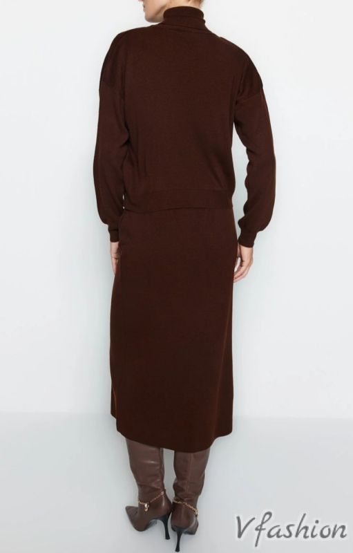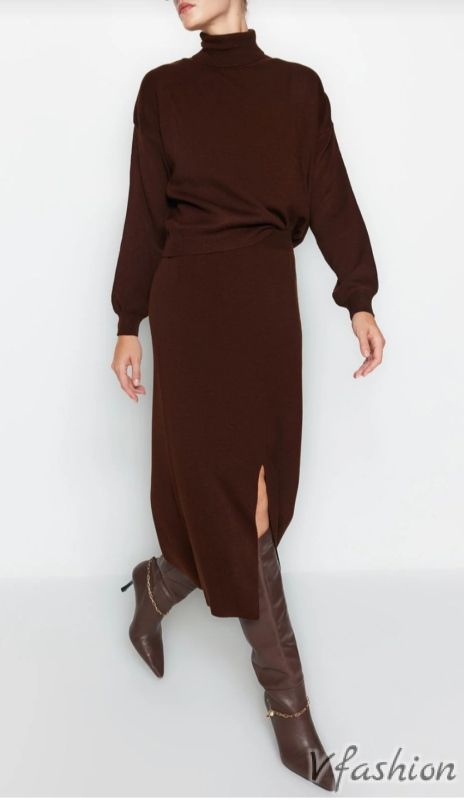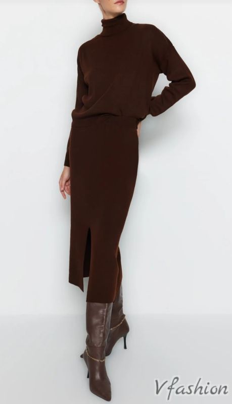 Много стилен и актуален комплект от пола по тялото и пуловер с поло яка.