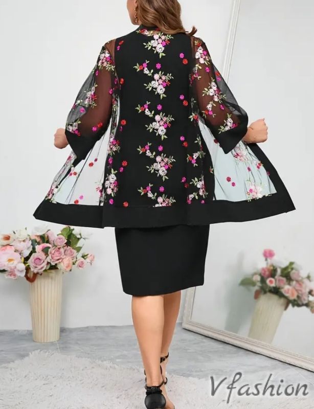 Много стилен комплект от рокля и наметка от тюл и бродирани цветя.