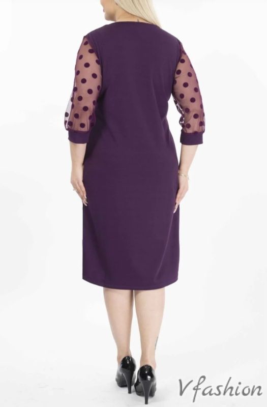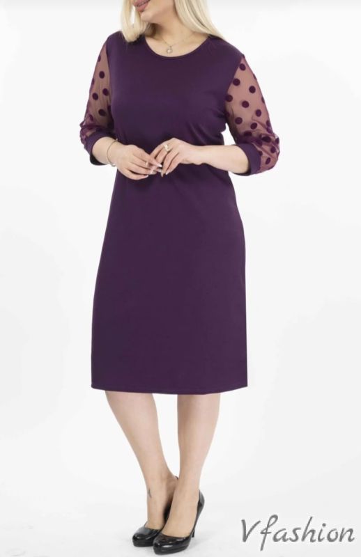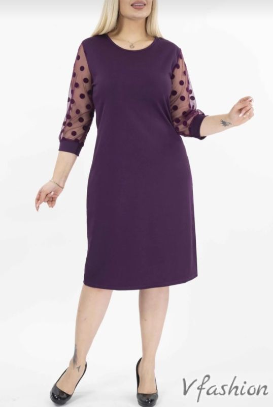 Елегантна рокля с ръкави от тюл на точки в лилаво. Материята е леко еластична.
