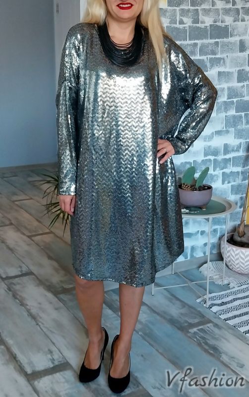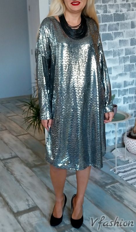 Елегантна, парти рокля със сребристи акценти. Роклята е от много приятна, леко еластична материя.