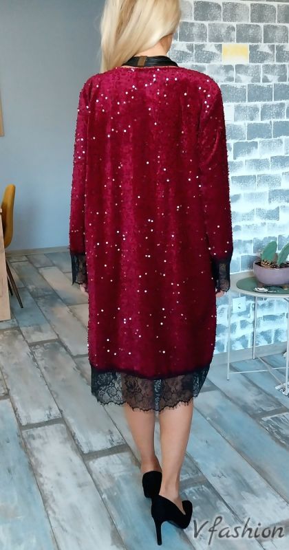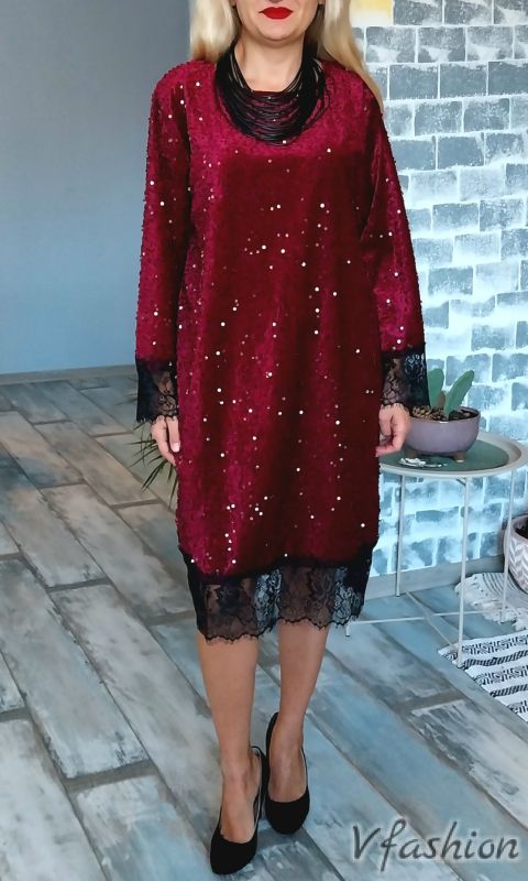 Стилна, официална рокля от фино кадифе с пайети и дантела.