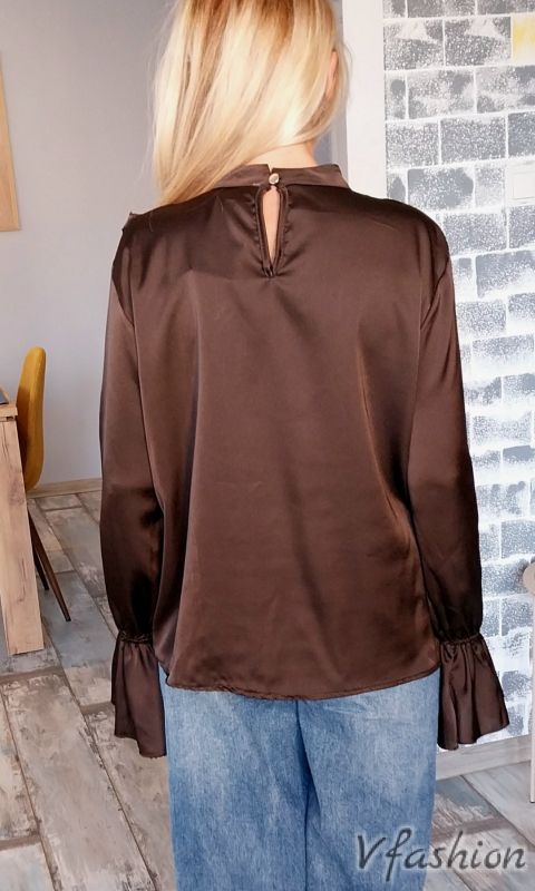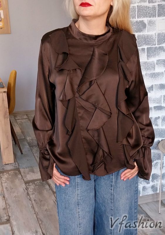 Сатенена блуза с волани - кафява