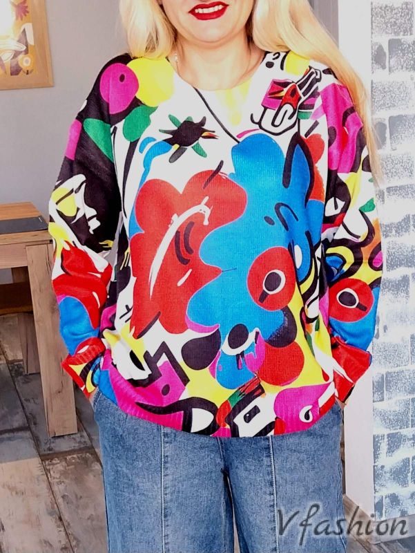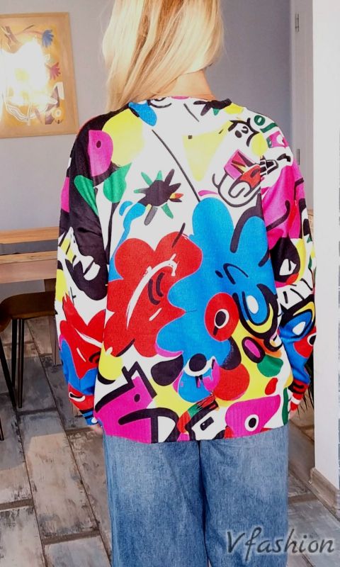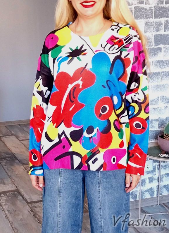 Актуален пуловер от фино плетиво с красив, арт принт.