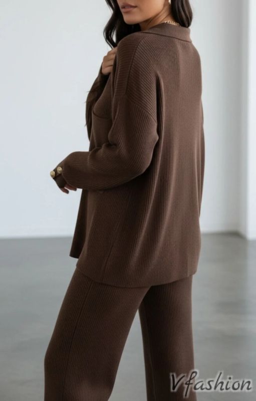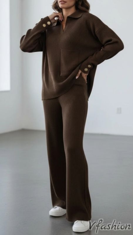 Спортно-елегантен комплект от панталон и пуловер с джоб и копчета за акцент. Панталонът е на ластик.