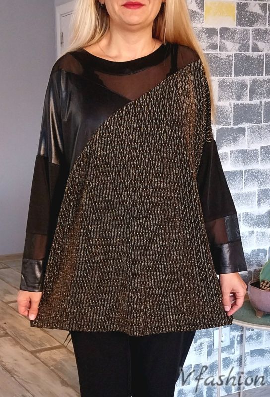 Елегантна блуза/туника с много актуални мотиви от тюл, еко кожа и златисти нишки. Материята е еластична.