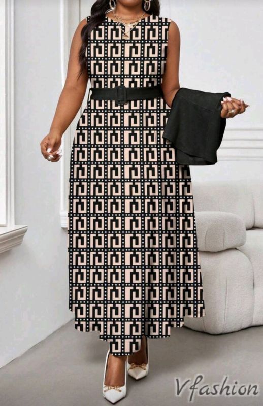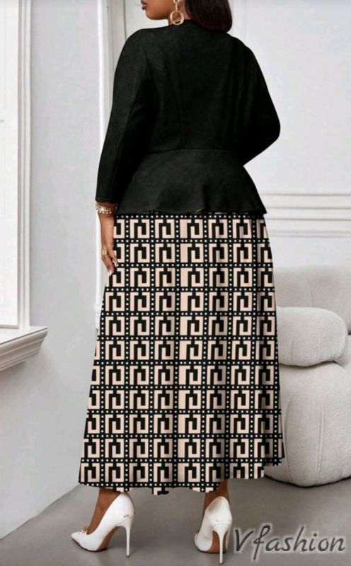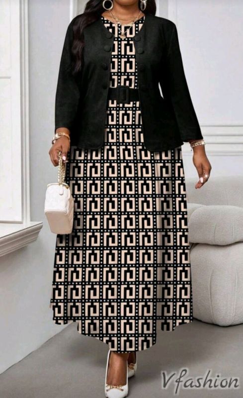 Много красив и стилен комплект от дълга рокля с геометричен принт и колан плюс черно сако. Материята е леко еластична.