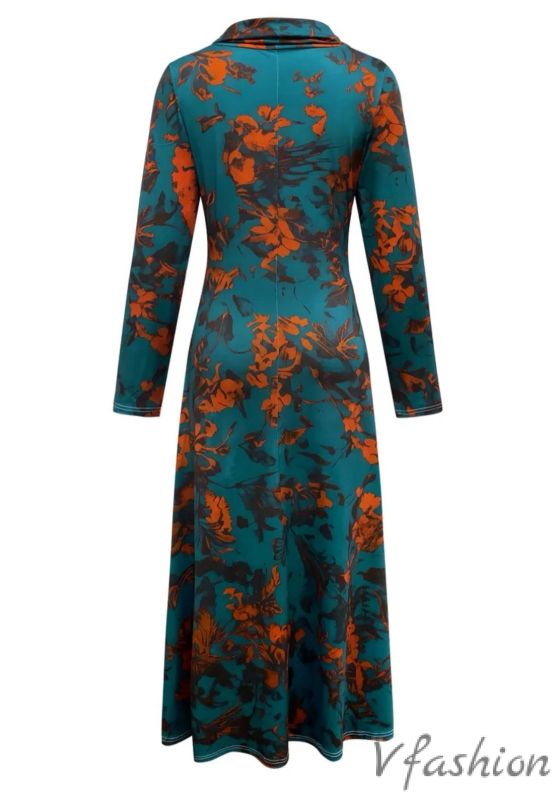 Дълга рокля от еластична материя с яка и артистичен, флорален принт.