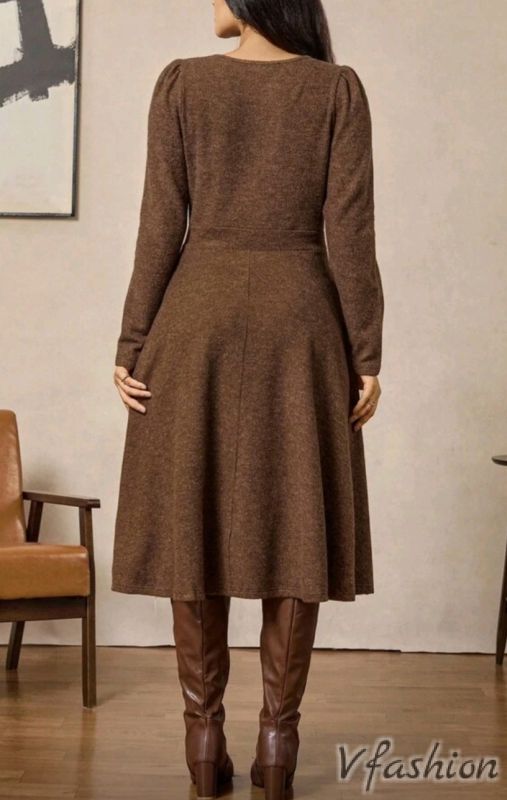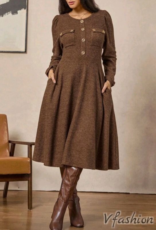Много стилна рокля в кафяво с удобни джобове и декоративни копчета за акцент.