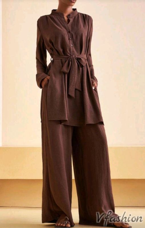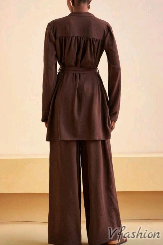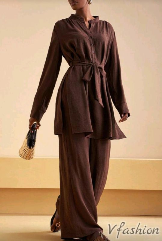 Красив, спортно-елегантен комплект от панталон и дълга риза с колан от плат.
