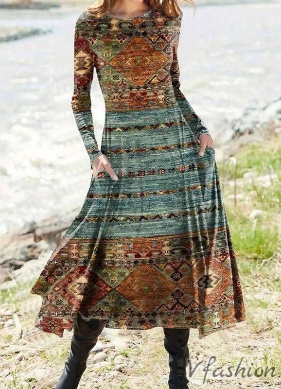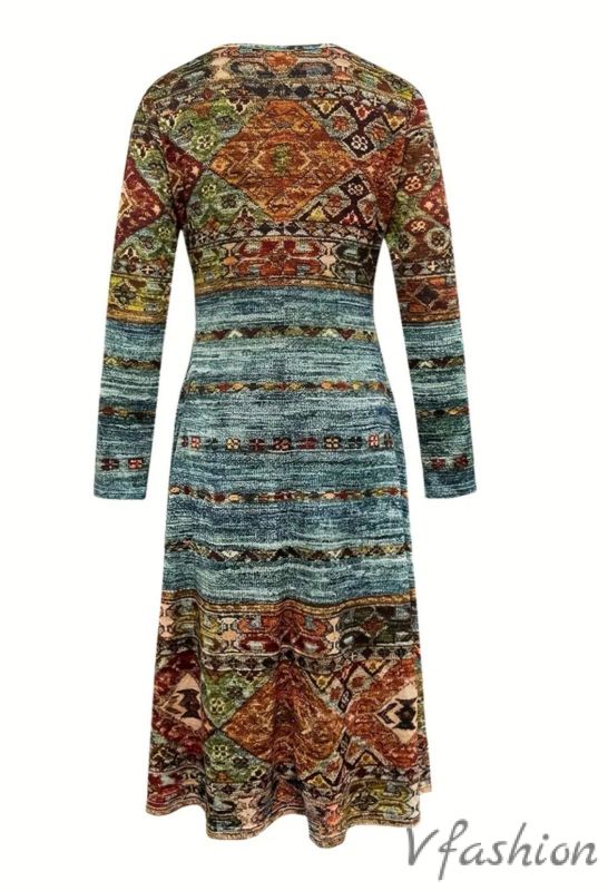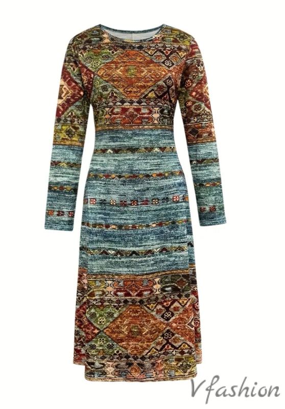 Много актуална рокля с принт във винтидж стил. Материята е еластично трико.