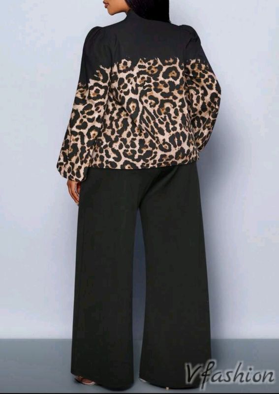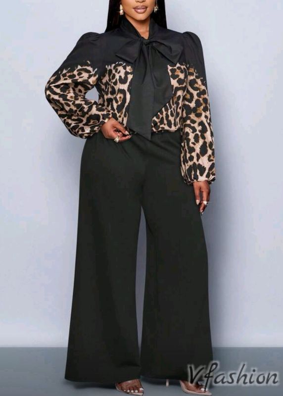 Елегантен комплект от еластичен панталон и блуза с панделка и леопардов принт.