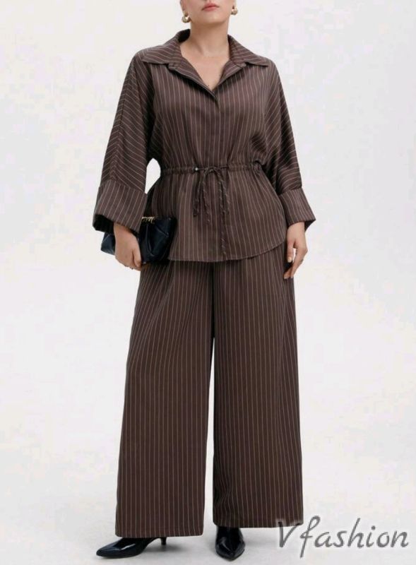 Спортно-елегантен комплект от панталон и риза с връзка на тънки райета.
