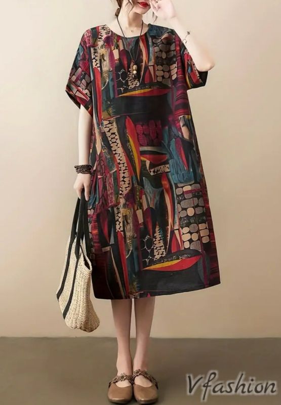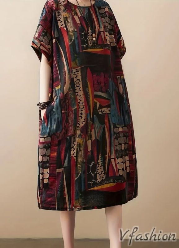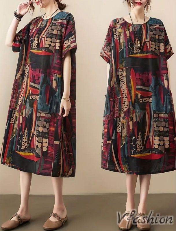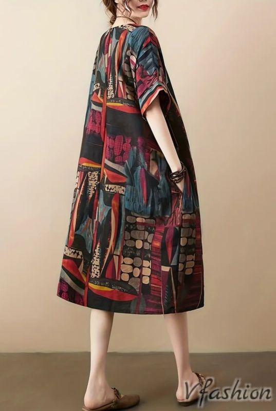 Ленена рокля с удобни странични джобови и принт в бохо стил.
