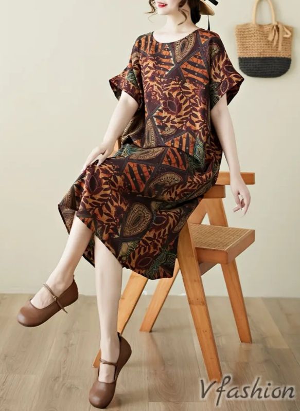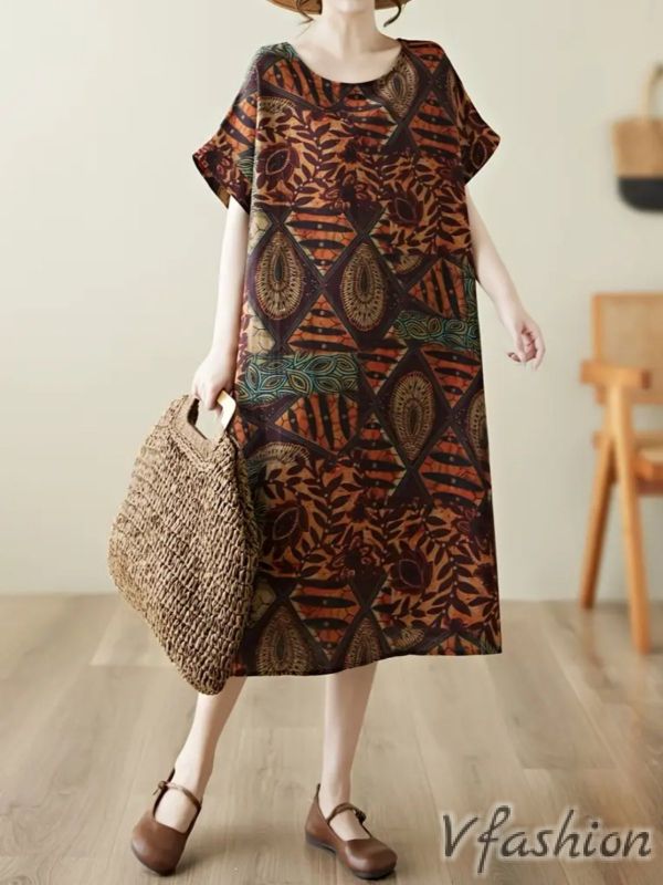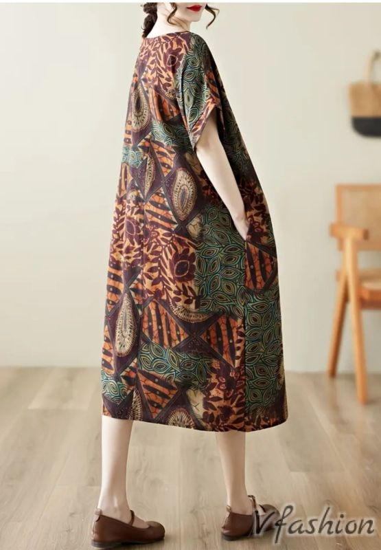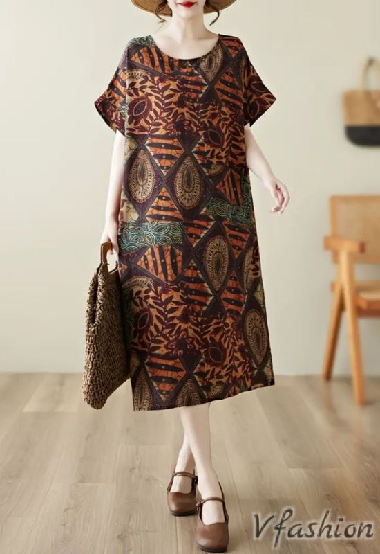 Ленена рокля с удобни странични джобови и принт в бохо стил.
