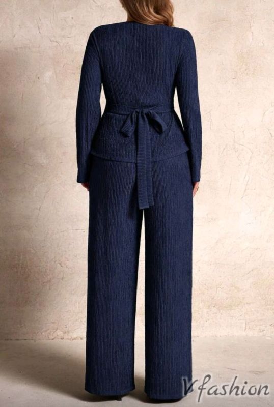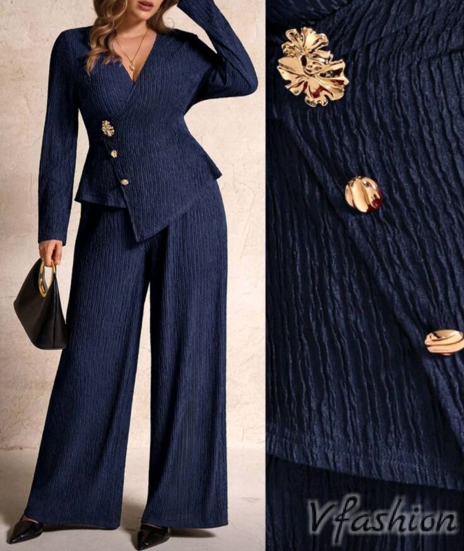 Спортно-елегантен комплект от панталон и блуза с връзка и метални мотиви.
