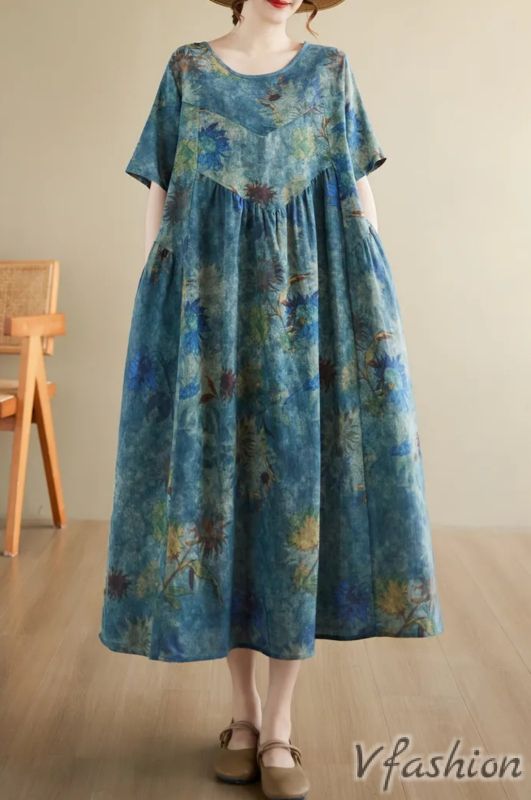 Ленена рокля с удобни странични джобови и много красив, арт принт.