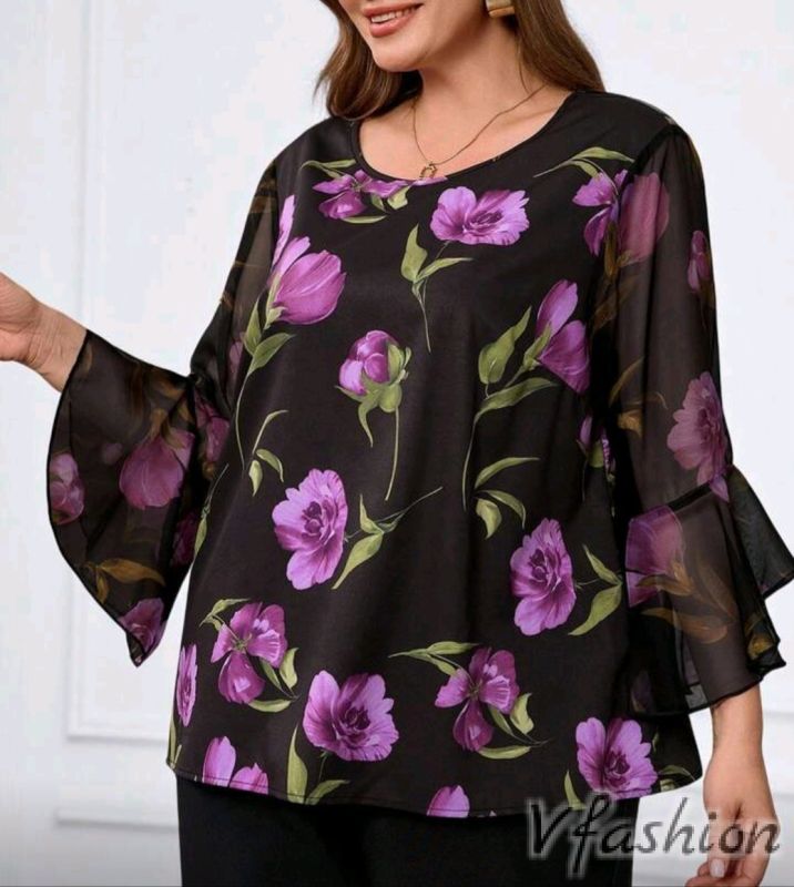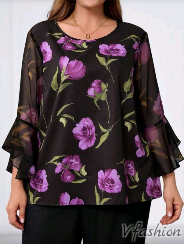 Стилна блуза с принт цветя и ръкави от тюл.