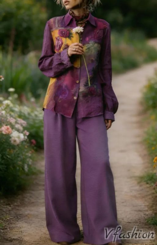 Спортно-елегантен комплект от панталон с джобове и риза с много красив принт.