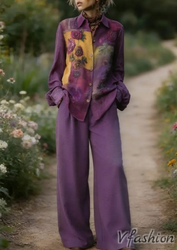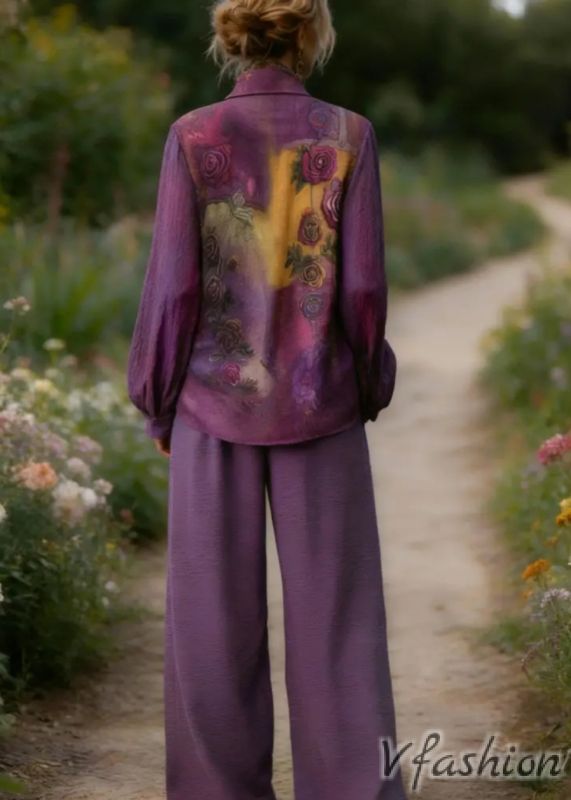 Комплект панталон и риза с принт - лилав