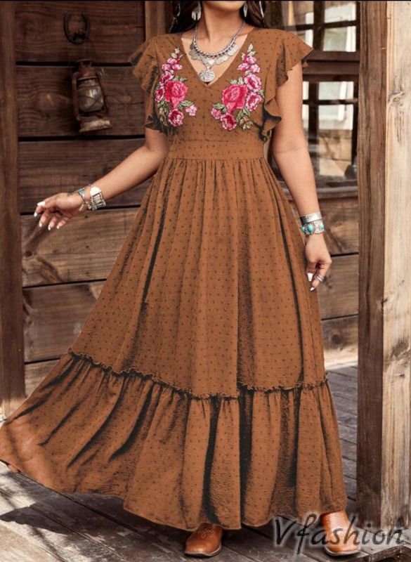 Разкроена рокля с бродерии - кафява
