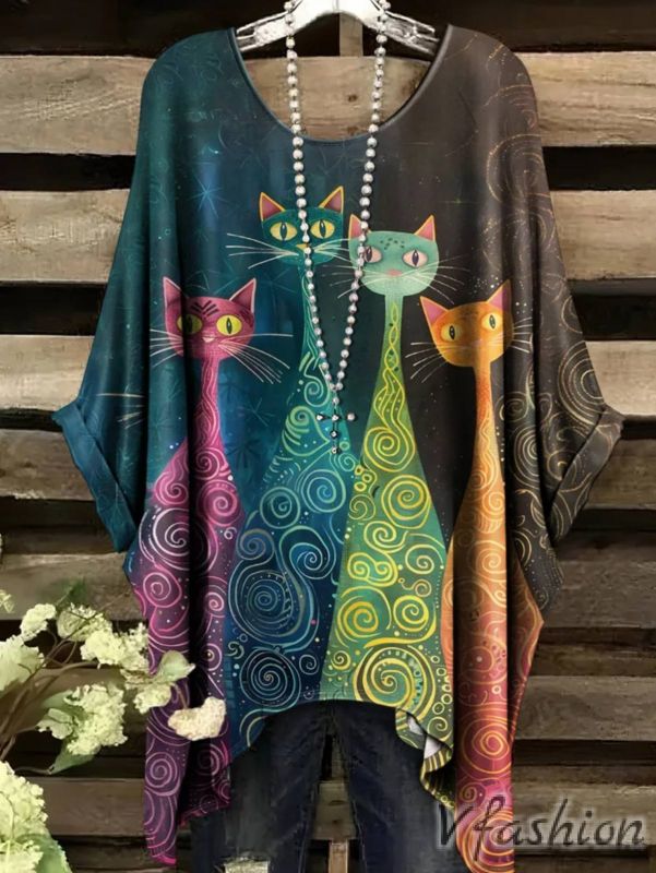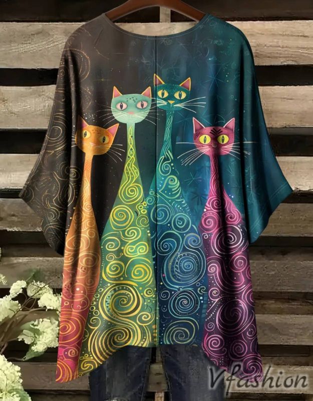 Много удобна и актуална блуза с принт котки на фон в преливащи цветове.
