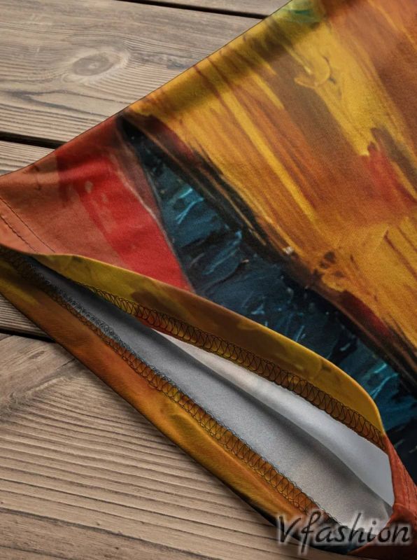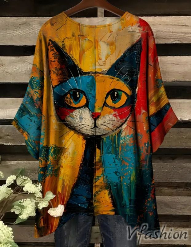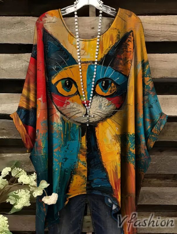 Много удобна и актуална блуза с принт котка на фон в преливащи цветове.