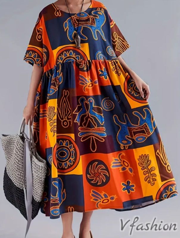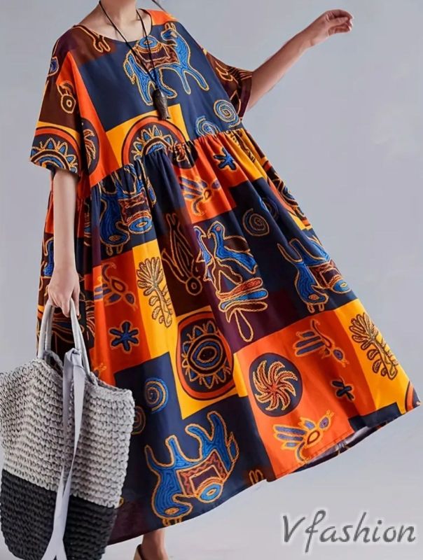 Цветна рокля с принт и джобове