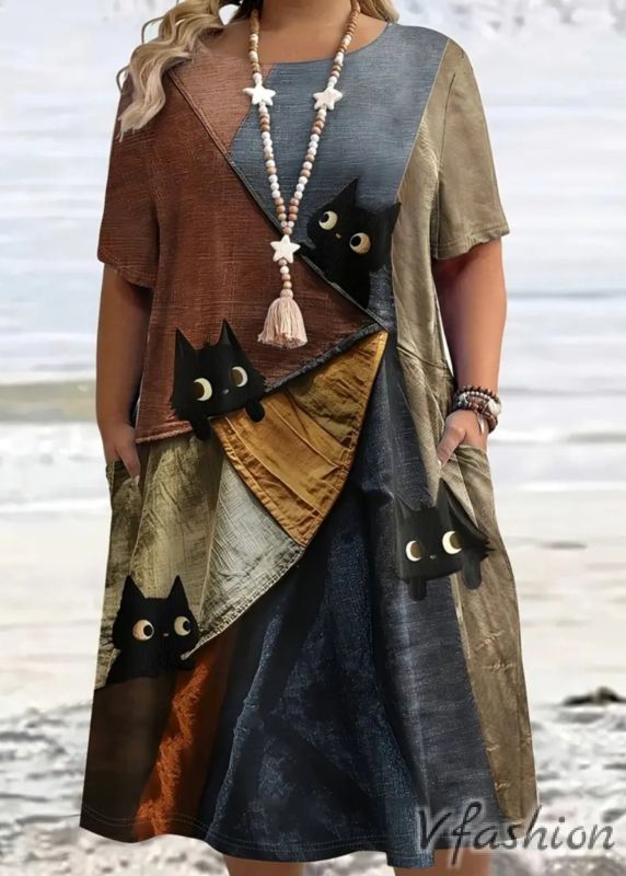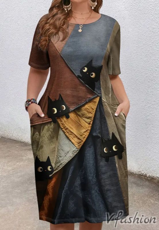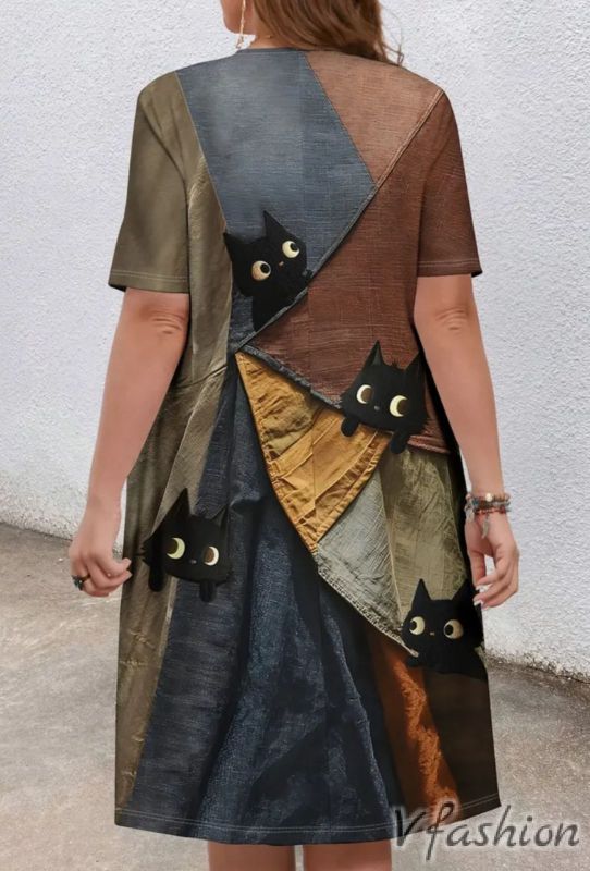 Много актуална, ежедневна рокля с удобни странични джобове и принт котки.