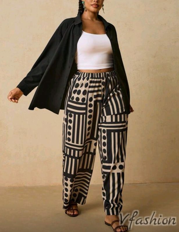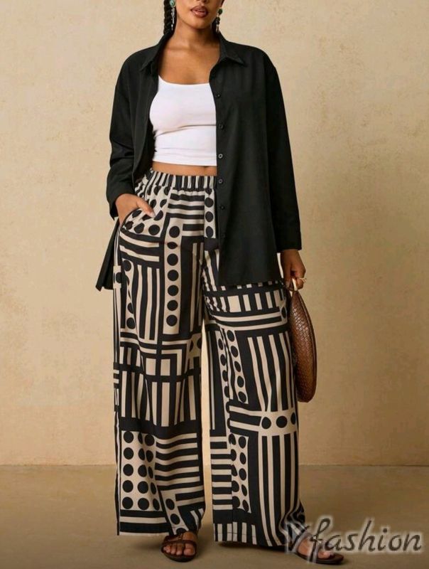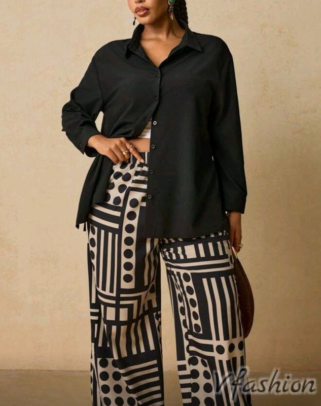Спортно-елегантен комплект от риза и панталон в черно и бяло на ластик.