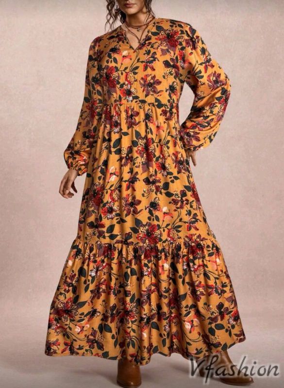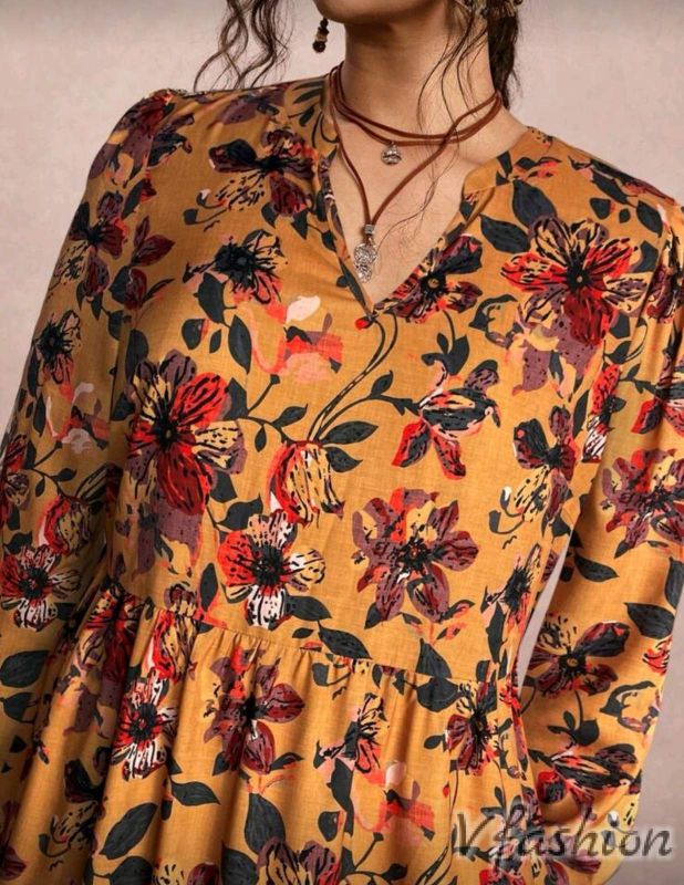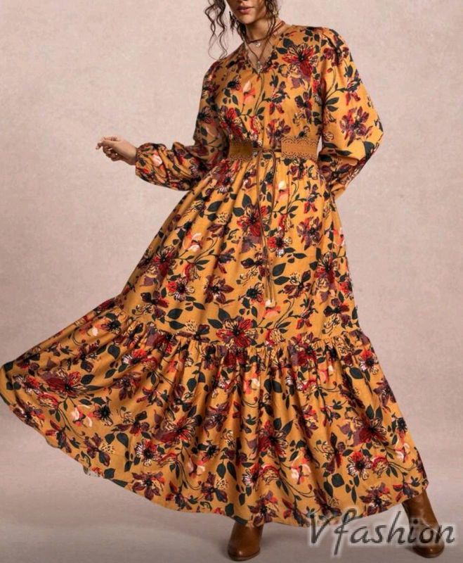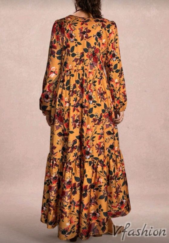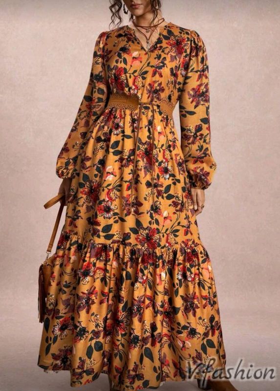 Дълга, разкроена рокля с принт красиви цветя в бохо стил.