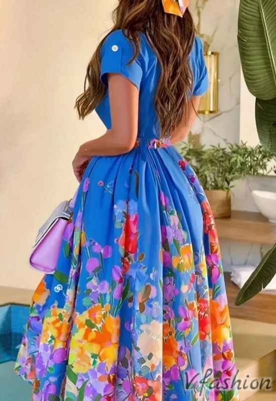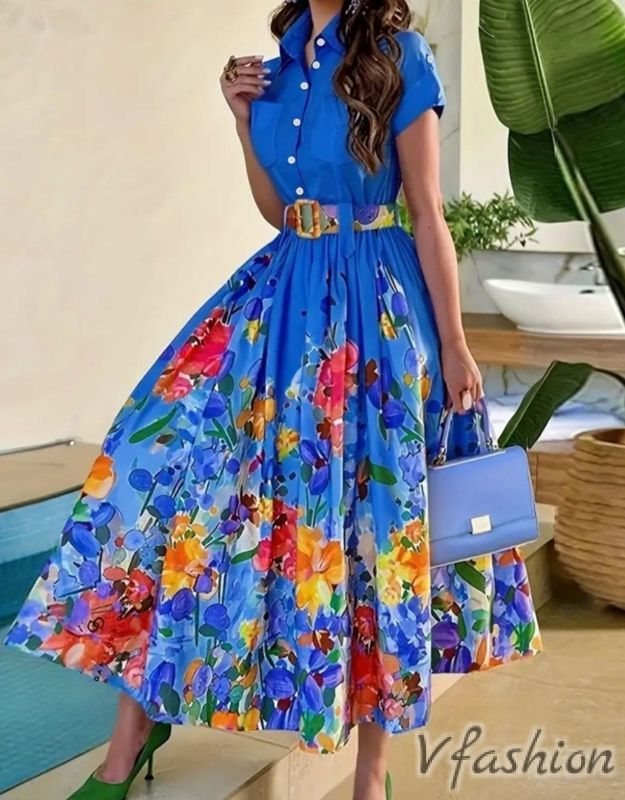 Дълга, разкроена рокля с принт красиви цветя. В горната част и с копчета и яка.