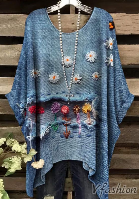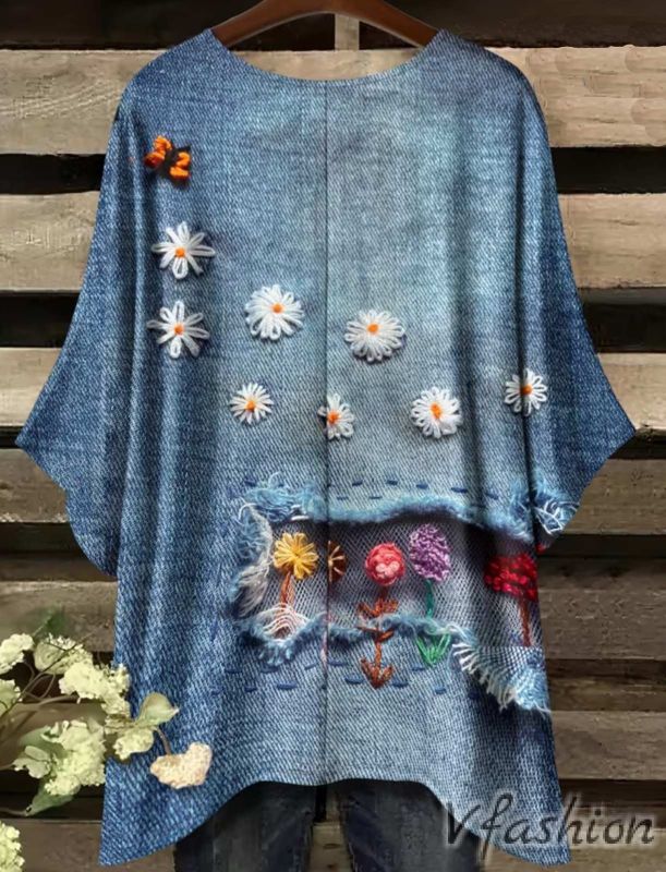 Много удобна и актуална блуза с принт, имитация на дънков плат с акценти.