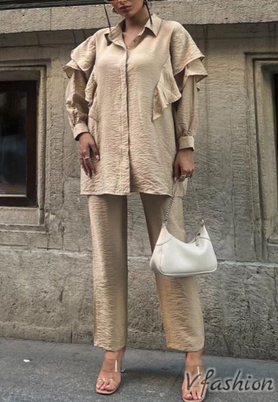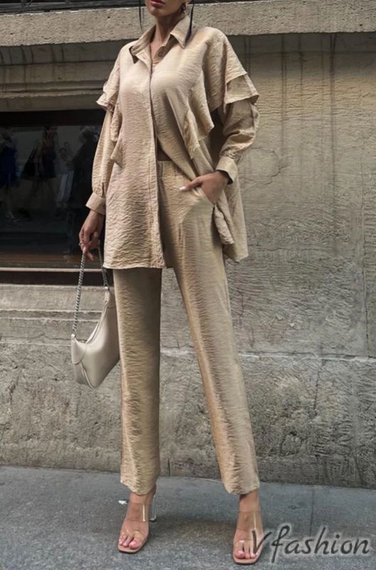 Комплект панталон и риза с волани - бежов
