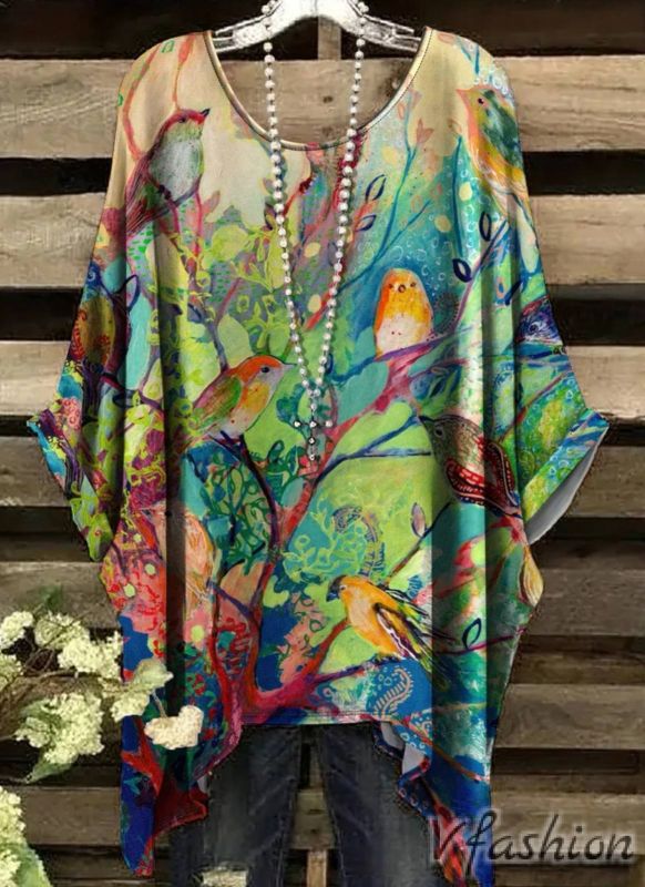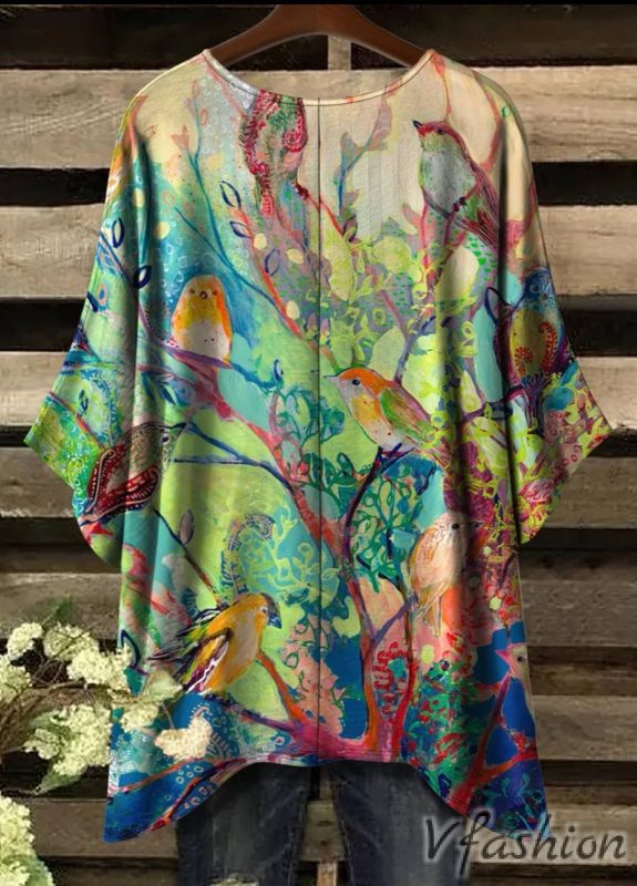 Много удобна и актуална блуза с принт красиви птици в нежни цветове.