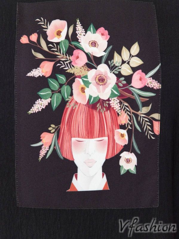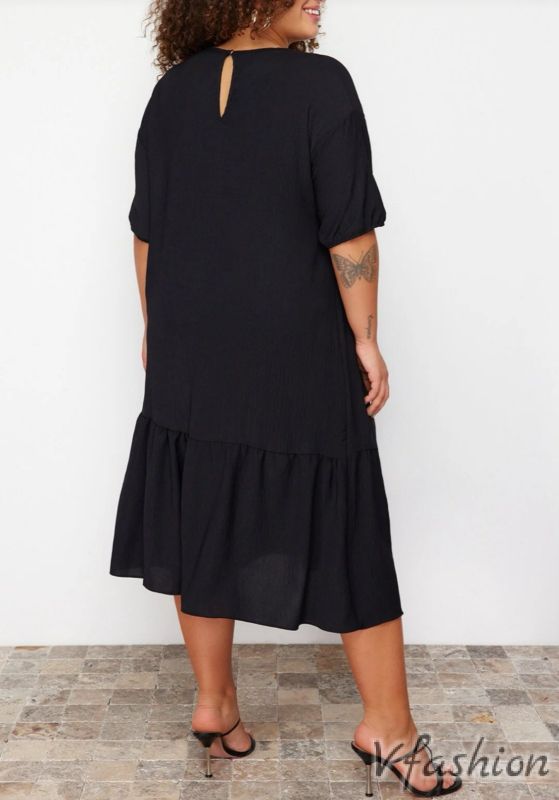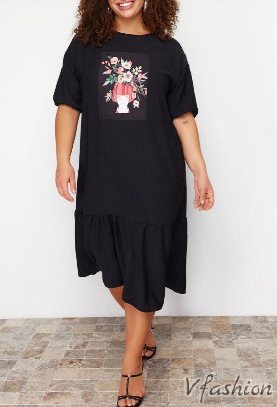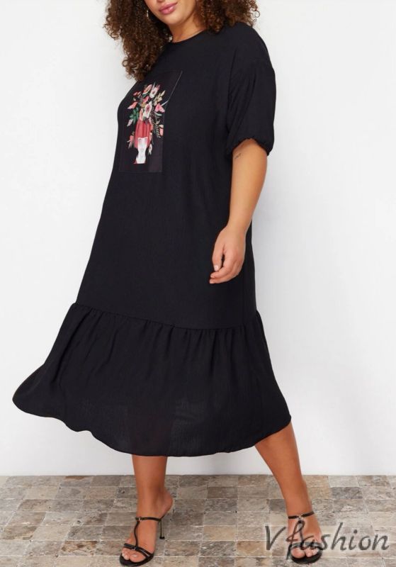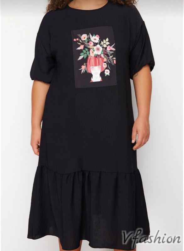 Разкроена рокля с волан и красива нашивка с цветя. Роклята е от много приятна материя.